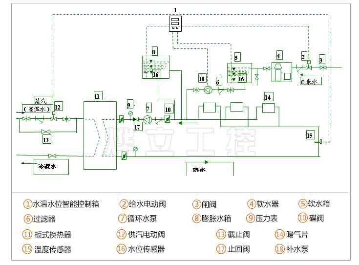 ①板式換熱器 ②供汽電動(dòng)閥 ③截止閥 ④暖氣片